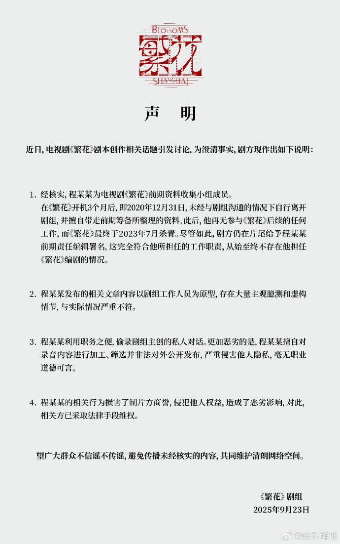 更具戏剧性的是,声明发布后,有技术博主通过对比发现,剧组此前公布的“官方声明模板”与此次文件格式存在多处差异,尤其缺失关键的公章和法务部门落款。结合古二此前透露的“剧本署名权纠纷”,公众质疑剧组此举是为掩盖创作团队内部矛盾。截至发稿,王家卫本人未对此事直接回应,而#繁花剧组声明漏洞# #王家卫避而不谈# 等话题阅读量已突破8亿,有网友调侃:“这哪是反转,分明是给舆论火上浇油。”